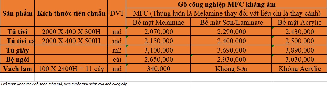 - Bảng báo giá thi công nội thất gỗ MFC phòng khách :