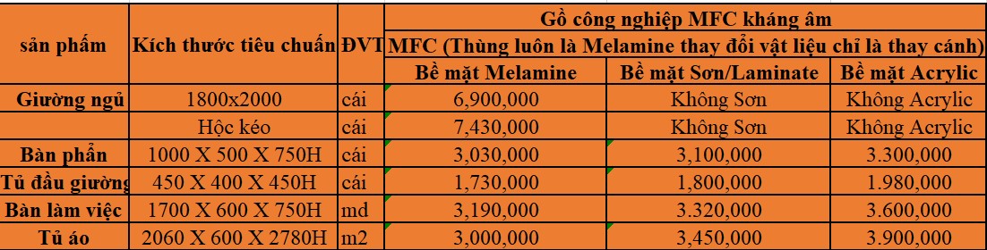 - Bảng báo giá thi công nội thất gỗ MFC phòng ngủ :