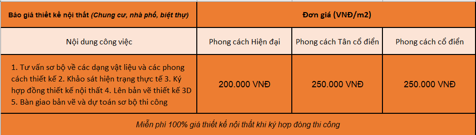 Bảng báo giá thiết kế nội thất mới nhất