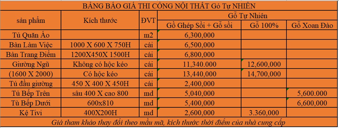 Bảng giá thi công nội thất với gỗ tự nhiên