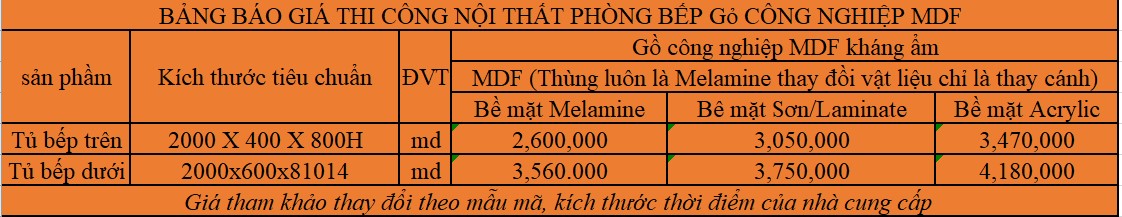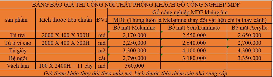 - Bảng báo giá thi công nội thất gỗ MDF phòng khách :