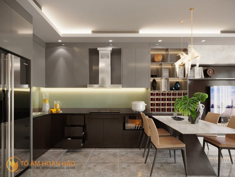 Không gian phòng khách bài trí nội thất khá đơn giản. Sofa góc tối giản là một sự lựa chọn tối ưu cho những phòng khách diện tích vừa đến nhỏ. Gam màu nâu xám trung tính đặc trưng càng làm nổi bật vẻ hiện đại. Kết hợp thêm những món đồ trang trí như đèn thả trần hình học,… giúp không gian có điểm nhấn nghệ thuật và cá tính hơn hẳn.