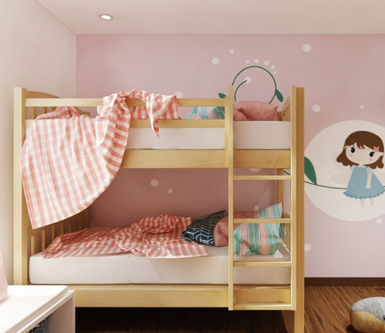 Phòng ngủ cho bé gái được sơn tông hồng dễ thương. Với diện tích nhỏ, các KTS đã lựa chọn giường tầng để không gian rộng rãi hơn mà vẫn đầy đủ các yếu tố công năng. Bàn học được đặt gần cửa sổ để bé có thể tận dụng ánh sáng tự nhiên