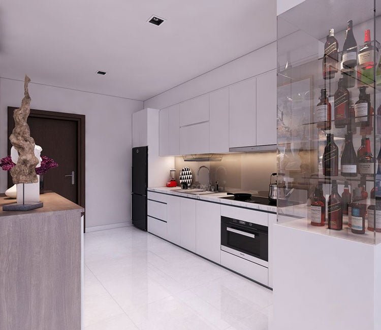 Với khu vực bếp nấu, gam màu trắng của gỗ MDF chủ đạo, kết hợp đá hoa cương thể hiện sự sang trọng cho khu vực sinh hoạt chung của căn hộ. Bên dưới được chia thành nhiều hộc tiện lợi là chỗ để dao dĩa, xoong nồi. Hệ thống tủ kệ khá ấn tượng với cách thiết kế sáng tạo trong từng góc nhỏ. Đặc biệt phía đối diện bếp còn có chỗ những ai nội trợ có thể ngồi chờ trong lúc nấu nướng.