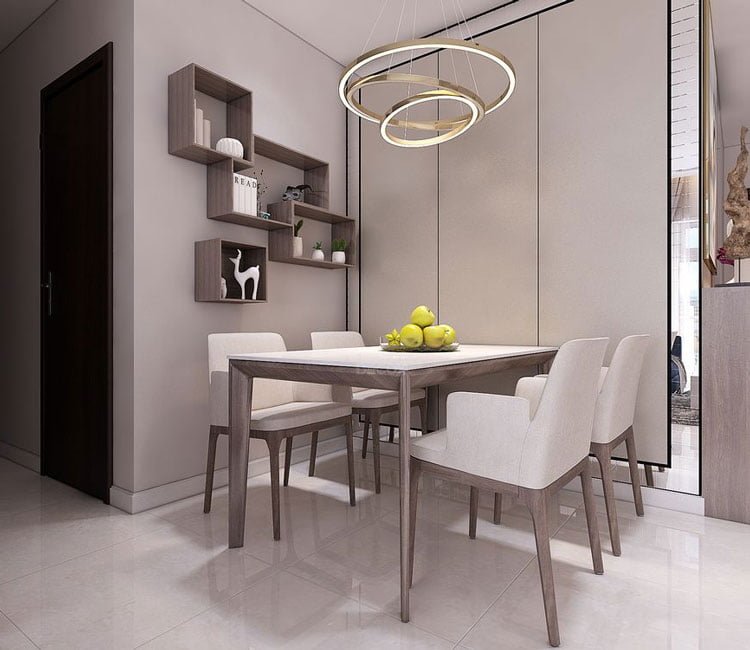 Nơi ăn uống sử dụng gỗ công nghiệp với vải bọc trắng đẹp mắt. Bố trí ấn tượng ngay từ những giây phút đầu tiên. Màu sắc của gỗ khá nhẹ nhàng, tone màu sáng chủ đạo mang đến cho gia chủ một không gian tiện nghi. Sử dụng nhiều kiểu dáng đèn chiếu khác nhau tô điểm cho căn hộ thêm bắt mắt và tránh sự nhàm chán.