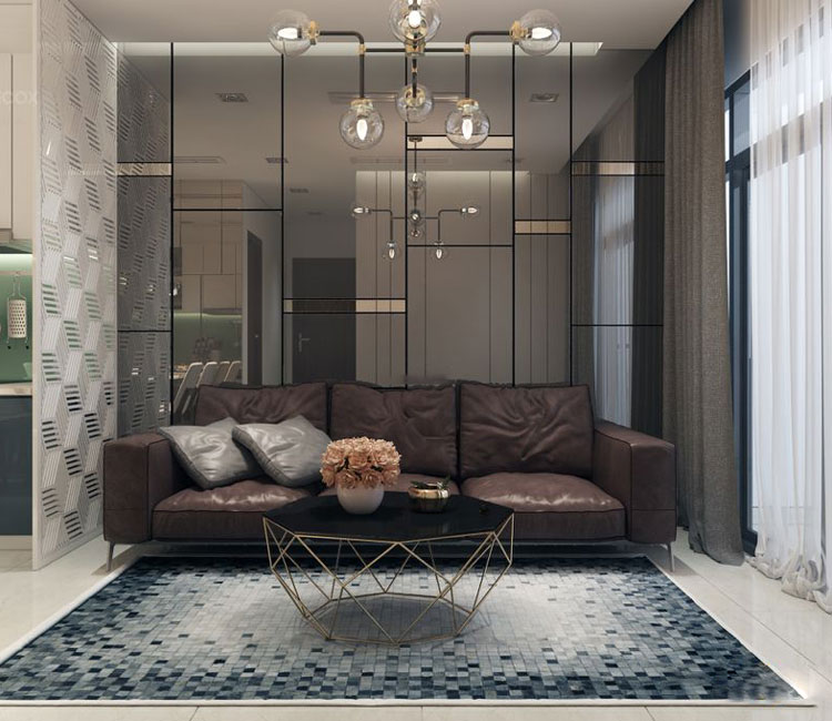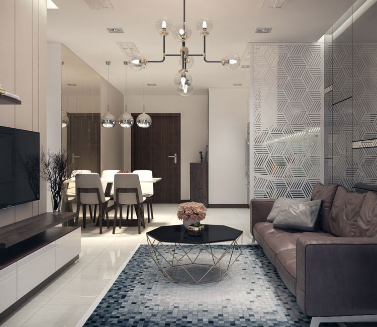 Ngăn cách không gian phòng khách và khu vực bếp ăn là hệ thống vách chất liệu đặc biệt, tạo sự thông thoáng và mang lại nét độc đáo cho cả không gian. Phòng bếp và phòng khách được thiết kế liên thông, giúp tiết kiệm tối đa không gian. Việc sử dụng thảm trải sàn với họa tiết độc đáo làm không gian trở nên cuốn hút hơn. Đèn trần không cầu kỳ nhưng có kiểu dáng lạ mắt tạo điểm nhấn không gian hiệu quả.