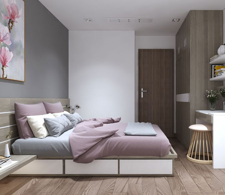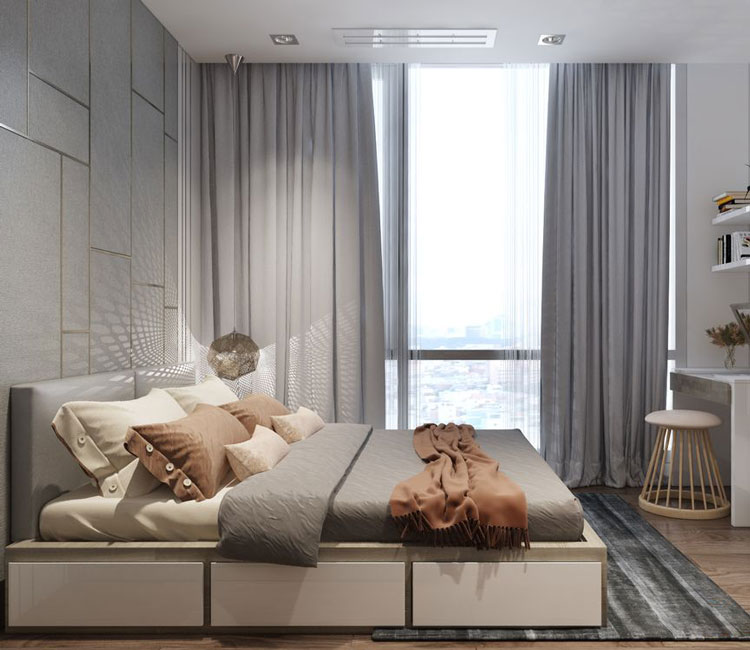 Trong thiết kế nội thất chung cư, phòng ngủ luôn được ưu ái thiết kế với những khung cửa sổ lớn, giúp không gian trở nên thông thoáng, tận dụng tối đa không khí và ánh sáng tự nhiên. Phòng ngủ tích hợp nhiều chức năng, giúp chủ nhân thuận tiện hơn trong sinh hoạt.