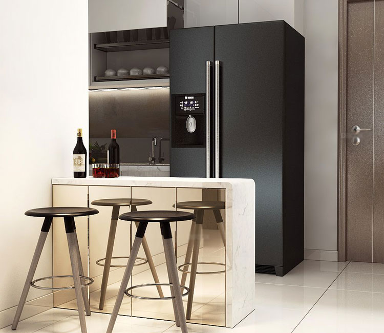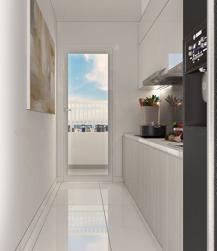 Phòng bếp bố trí liên thông phòng khách với mang vẻ đẹp dân giã, mộc mạc. Toàn bộ hệ tủ bếp sử dụng chất liệu nhựa cao cấp, mang đến vẻ đẹp hiện đại, trẻ trung cho không gian bếp. Chiếc đèn trần khối hình hộp độc đáo là điểm nhấn hoàn hảo cho căn bếp xinh xắn. Quầy bar thiết kế rất đơn giản với những tầng kệ lưu trữ nhỏ, chủ nhân có thể trang trí, bày biện hoặc cất giữ những hộp gia vị tại đây.