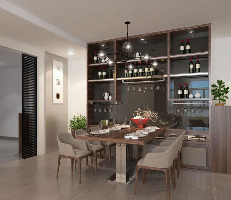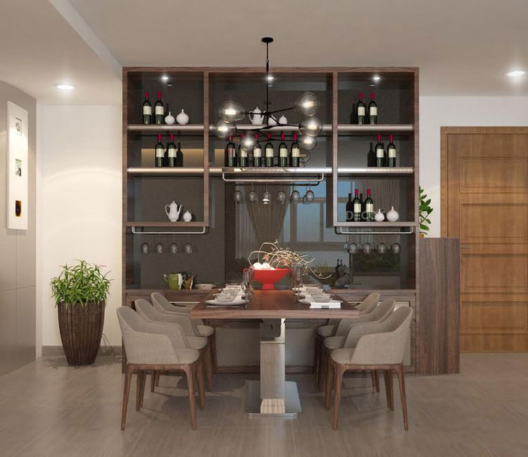 Không gian chung tích hợp nhiều chức năng như phòng khách, phòng ăn, phòng thờ tự. Vị trí đặt ban thờ sử dụng vách ngăn gỗ, mang lại sự tôn nghiêm, trang trọng cho khoảng không gian tâm linh của gia đình. Tủ rượu được bố trí ngay khu vực bếp, vừa tiện dụng, vừa có tác dụng trang trí độc đáo.