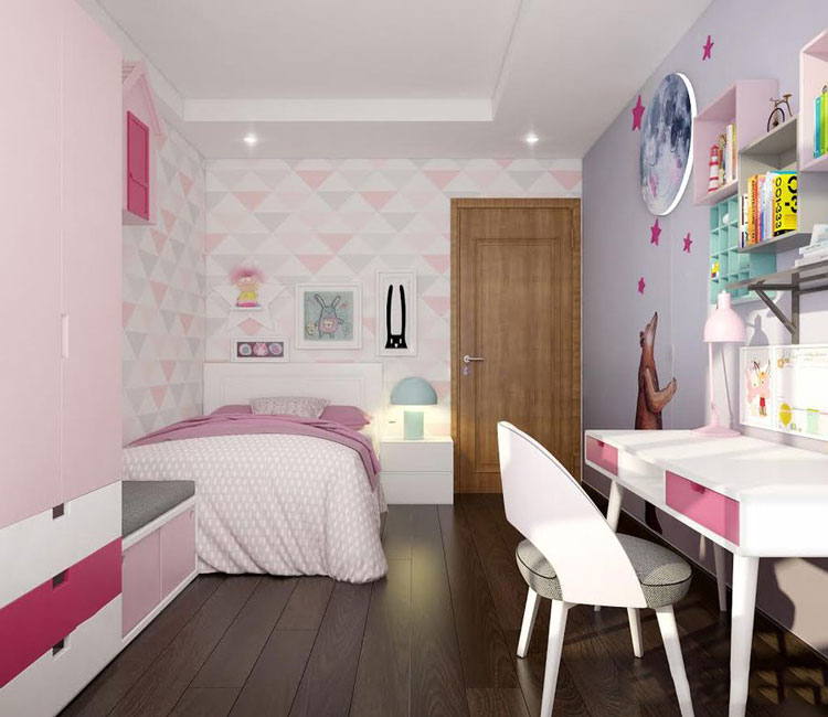 Phòng ngủ được thiết kế theo sở thích và phù hợp với lứa tuổi của từng thành viên trong gia đình. Phòng ngủ bố mẹ đơn giản nhưng tinh tế, tiện nghi. phòng ngủ con thiết kế tone màu hồng phấn với những họa tiết đáng yêu, phù hợp với tâm lý và sở thích của các bé. Việc tạo nên một không gian riêng tư yêu thích cho mỗi cá nhân góp phần gắn kết các thành viên trong gia đình, khiến mỗi người cảm thấy gắn bó hơn với ngôi nhà của mình.