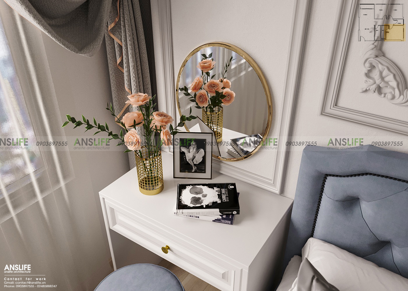Tap đầu giường có thiết kế đa năng, vừa có thể để các vật trang trí như tranh ảnh, lọ hoa, vừa có thể biến thành một bàn trang điểm cho các nữ gia chủ chỉ bằng cách lắp vào đó một chiếc gường tròn xinh đẹp.