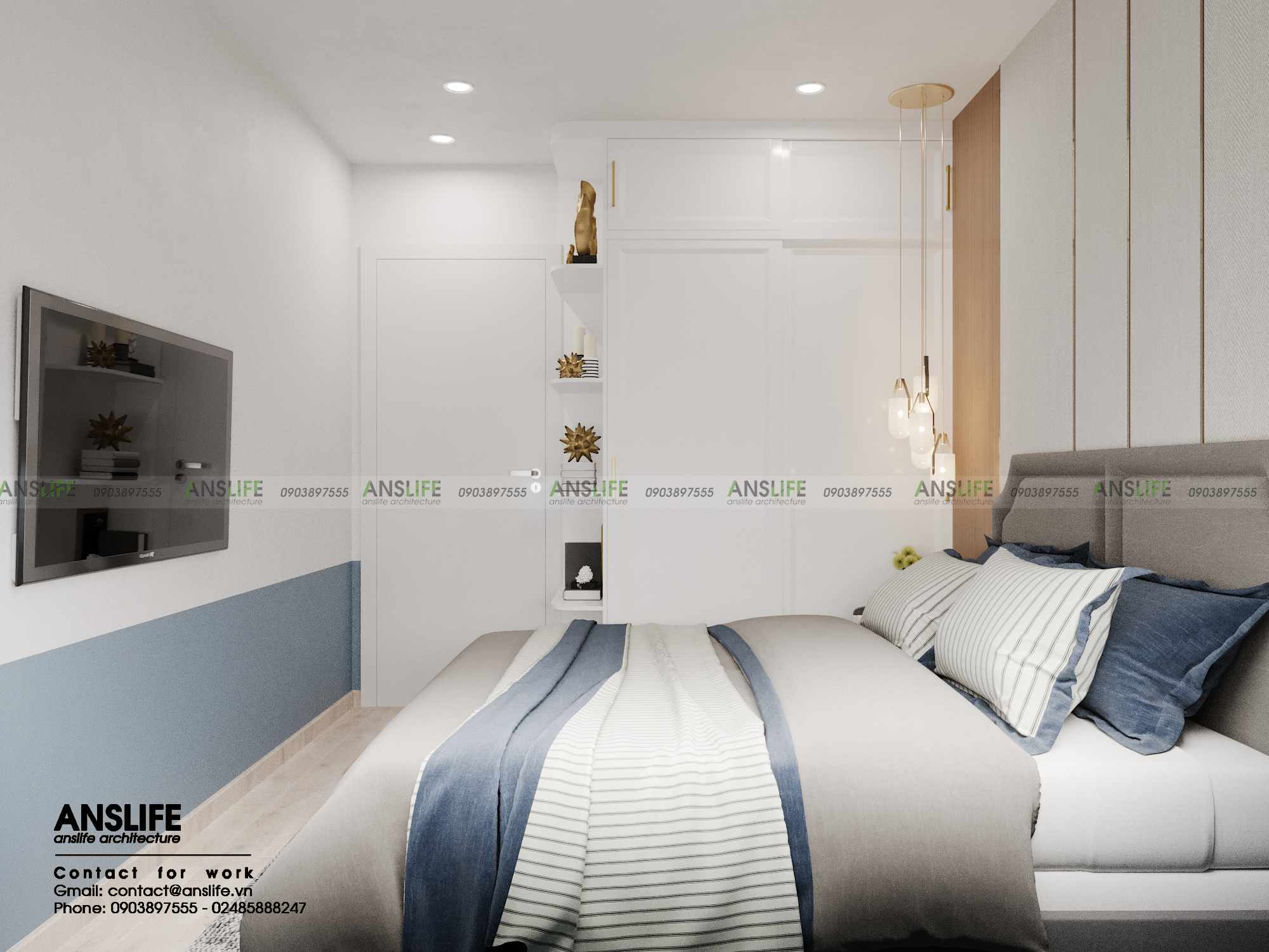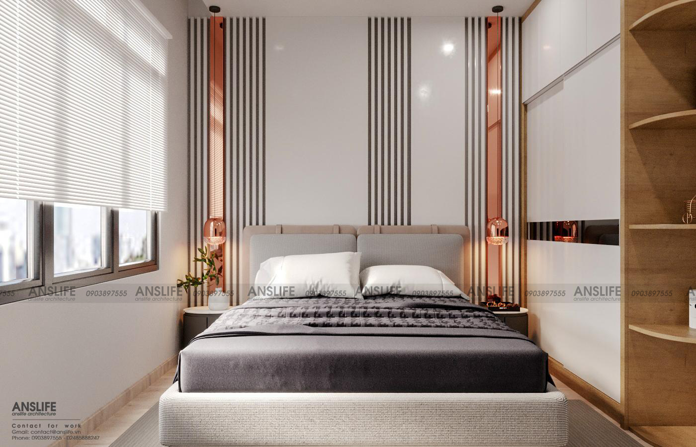 Để tối ưu được nhu cầu lưu trữ các vật dụng cá nhân, hệ tủ quần áo cao sát trần lại được sử dụng có tích hợp các ngăn kệ dùng làm nơi trưng bày sách hoặc các bức tượng nghệ thuật trang trí.