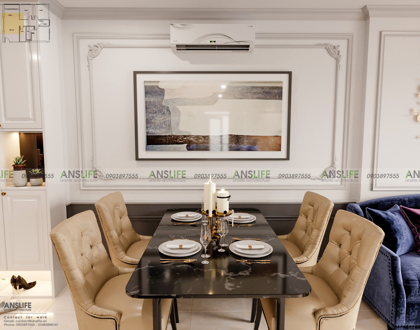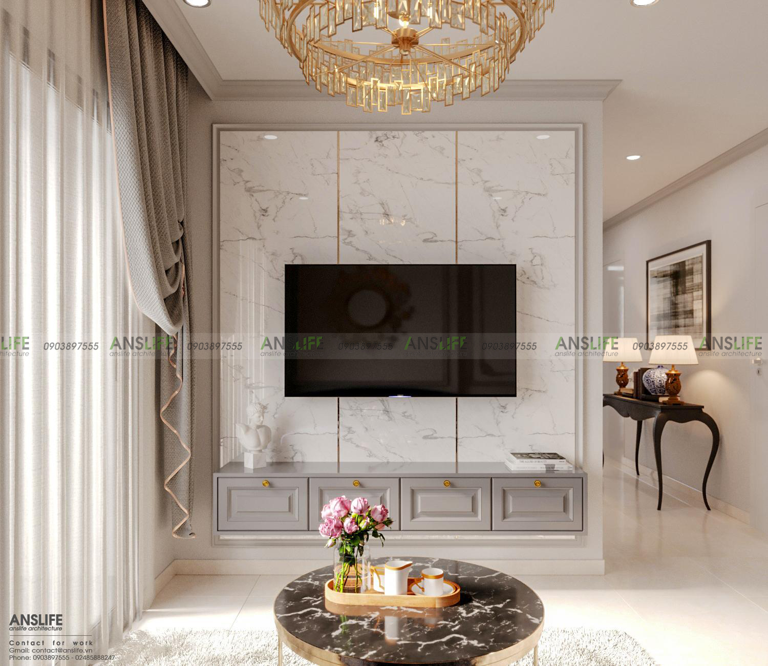 Để tạo nên một phòng khách với kiến trúc phong cách báncổ điển, cần có sự kết hợp đủ 4 yếu tố: Màu sắc, chất liệu, họa tiết, nội thất chúng tôi đã tư vấn cho gia chủ sử dụng gam màu trung tính như trắng, ghi làm màu nền cho toàn bộ căn hộ, sử dụng các chất liệu kim loại màu vàng đồng cao cấp làm điểm nhấn, để nổi bật các chi tiết và tổ điểm cho không gian trở nên ấm cúng và sang trọng