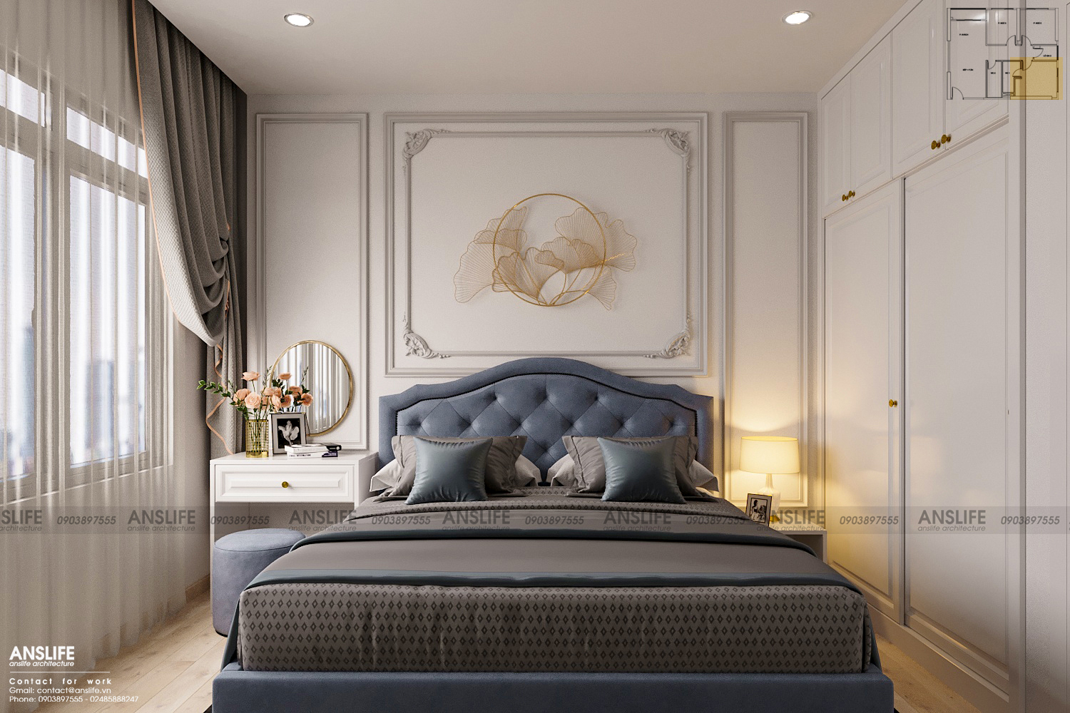 Thiết kế nội thất chung cư phòng ngủ master vói tone màu chủ đạo trắng tinh tế. Vạch tường họa tiết phào chỉ đối xứng thường thấy trong các mẫu nội thất tân cổ điển. Để hoàn thiện phần tường, chúng tôi đã treo vật dụng trang trí có họa tiết tròn hình lá lạ mắt tạo cảm giác nhẹ nhàng cho phòng ngủ.