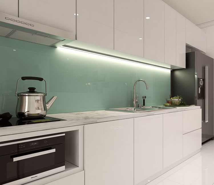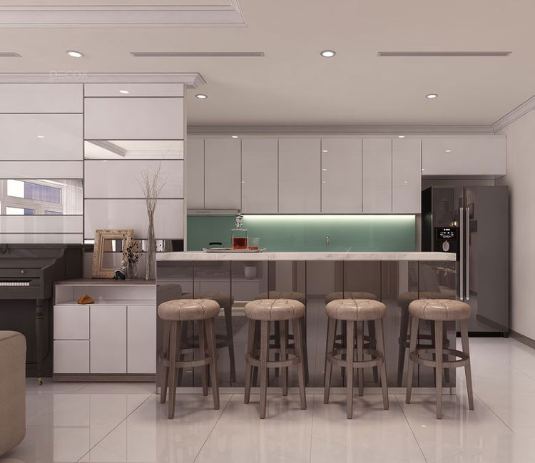 Khu vực bếp ăn có quầy bar, vừa thuận tiện khi thao tác nấu bếp, vừa có tác dụng ngăn cách khu vực nấu nướng với các khu vực khác. Tủ bếp chất liệu gỗ công nghiệp cao cấp, khả năng chống chịu nước cao, mang đến sự thẩm mỹ và độ bền vượt trội cho nội thất công trình.
