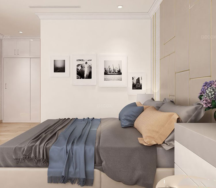 Phòng ngủ được thiết kế đơn giản với khung cửa sổ diện tích lớn, giúp đưa ánh sáng và không khí tự nhiên vào căn phòng. Những bức tranh xinh xắn làm căn phòng thêm sinh động.